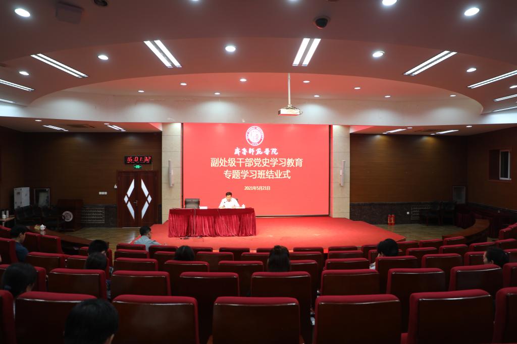 5月21日下午,学校在章丘校区学术报告厅举行了副处级干部党史学习教育专题学习班结业式。党委副书记刘宝君出席仪式并讲话,全体学员参加了仪式。结业式由党委委员、组织部长李伯伟主持。