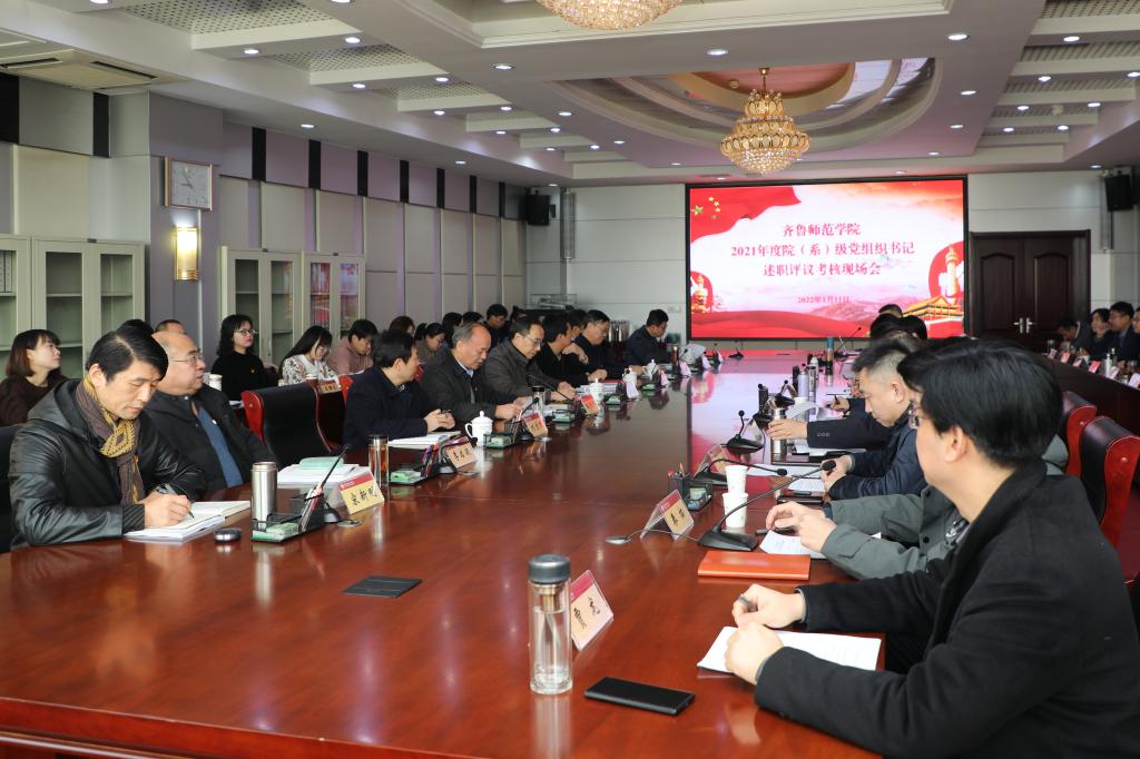 1月11日上午,我校在章丘校区图书馆四楼会议室举行2021年度院(系)级党组织书记履行全面从严治党责任和抓基层党建述职评议考核现场会。省委教育工委副书记、教育厅党组副书记、副厅长(正厅级)冯继康莅临指导督导并作点评讲话,省委教育工委组织处正处级组织员丁健到会指导。学校党委书记王玉华主持会议,学校领导班子成员、各党总支书记、有关部门负责人及部分基层党员干部群众代表等参加会议。